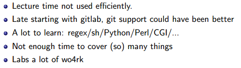 A lot to learn in this course, and in the later half part, the lectures were not well organized as the lectures of shell and perl.