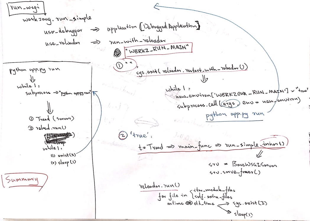 python app.py run→run_wsgi()→werkzeug.run_simple() werkzeug.run_simple()- apistar/commands/run.py:26: 因为默认启用了reloader(自动重启server), 这时会去检查WERKZ_RUN_MAIN这个环境变量:- 第一次为