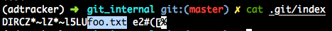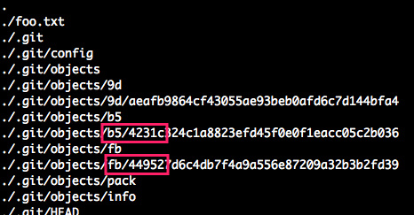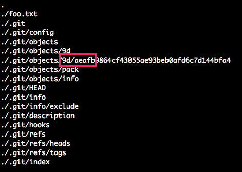 操作: 新建文件foo.txt, 并执行git add foo.txt → 自动生成了一个文件(.git/objects/9d/aeaf…)