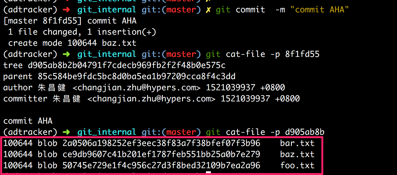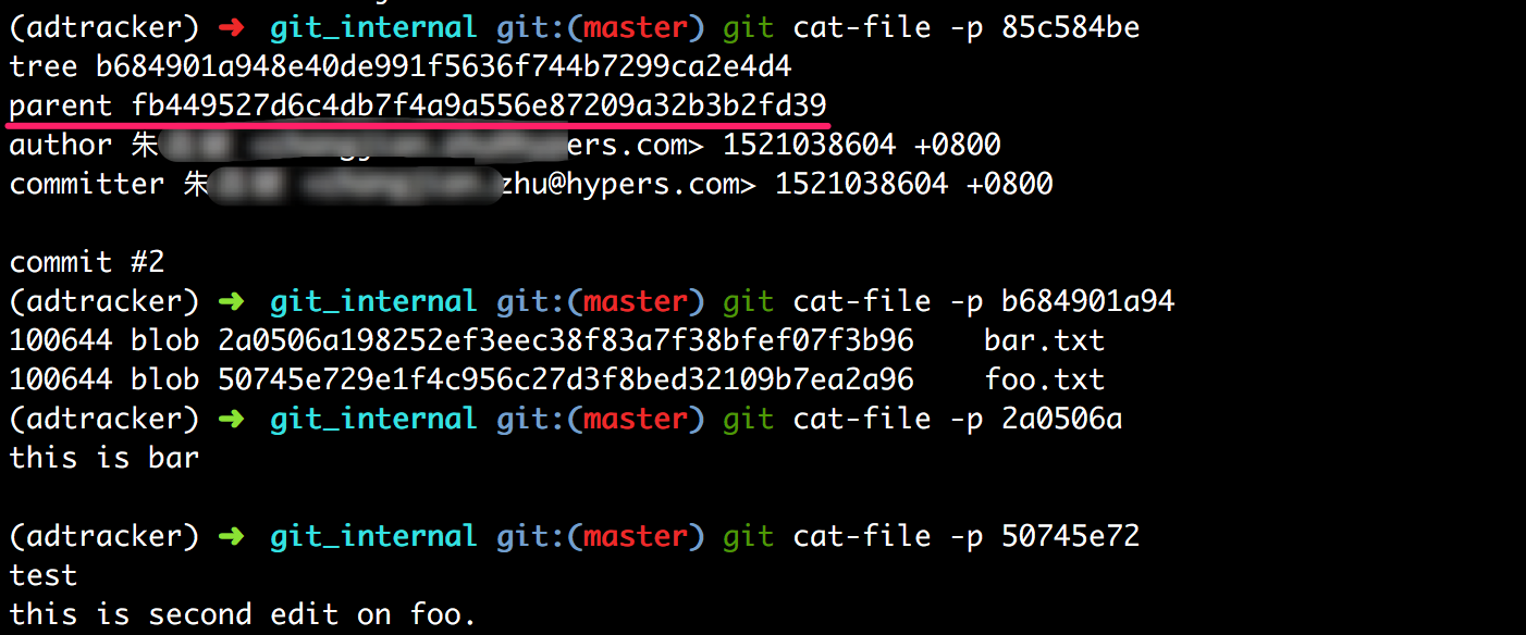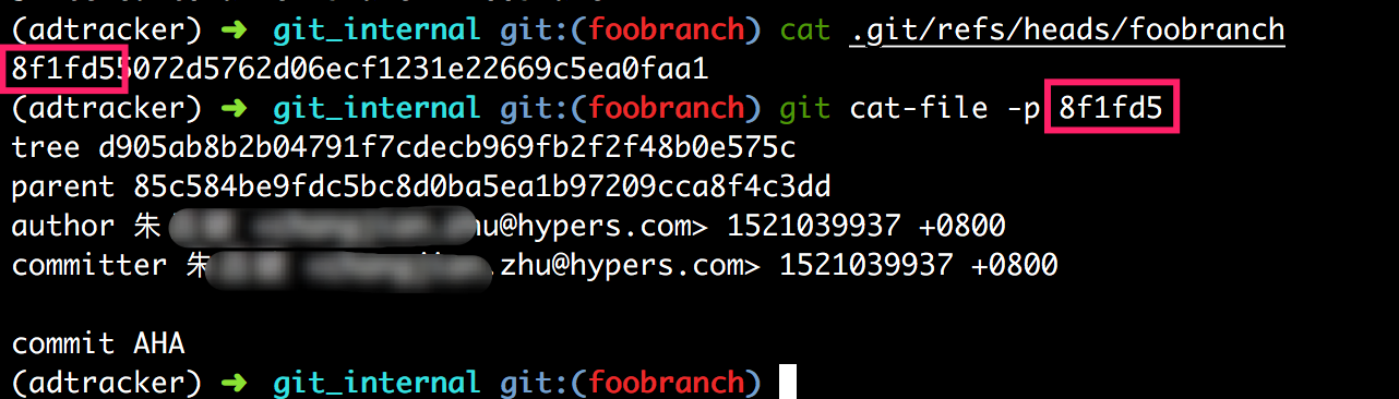cat .git/refs/heads/foobranch → 8f1fd5… → git cat-file -p 8f1fd5 → 第三个commit