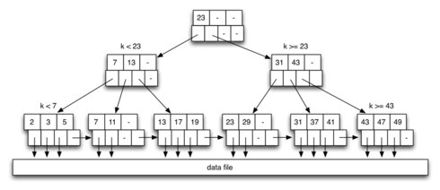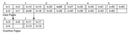 所以对数据库的有序存储做了一个优化: 首先按范围分好区间, 每一块代表一个page(见下图), 当某个区间存满了之后, 会链接(link)一个新的Overflow Page继续存储. 因为大部分情况下, 都是少量的插入与删除(Large-scale file re-arrangement occurs less frequently). 最终可以二分查找搜索page, 再去遍历搜索具体的记录.
