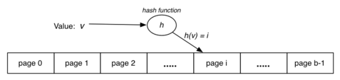 最简单就是取余. 例如有数组[1, 3, 4, 7, 8, 9], 并假设只有3个page可以存储, 就对每个数字除以3取余: [1, 0, 1, 1, 2, 0], 其中每个数字就对应插入和查询的位置(page0, page1, page2).