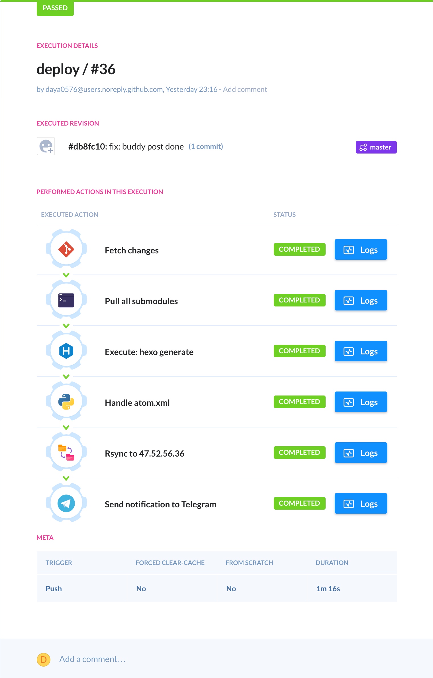 最后快速吸引我眼球的自动化部署工具叫做 Buddy, 每次 GitHub 更新代码后就会自动触发执行部署: