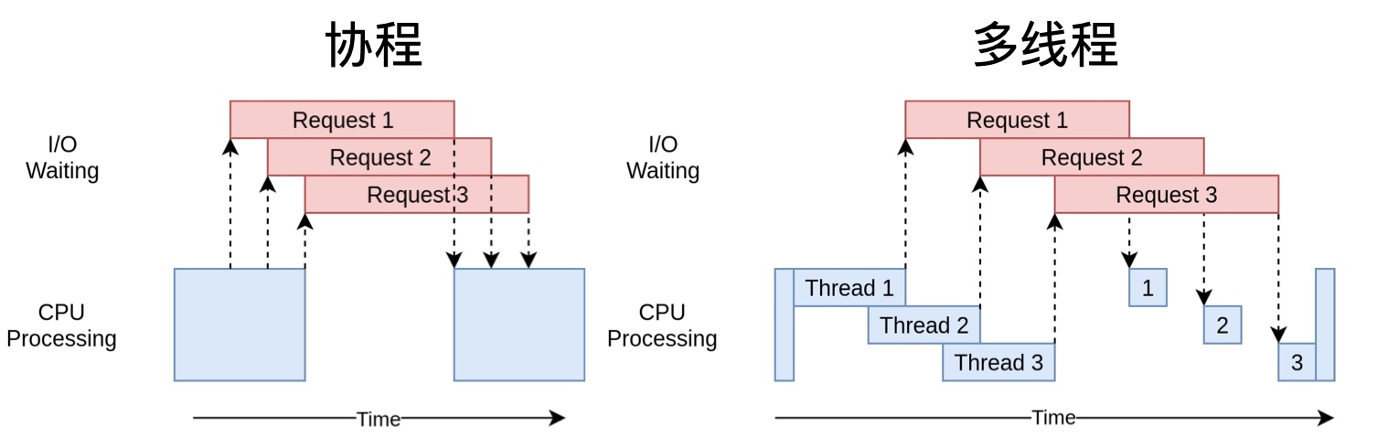 co其实就是相互协作的意思, async IO is a single-threaded, single-process design: cooperative multitasking, 精髓就是在一个进程一个线程内的协作. - 和多线程对比: 多线程是在操作系统去调度, 控制执行的顺序. 协程更多的是从代码层面announcing when they are ready to be switched out. 可以参考下面这张图, 很清晰: