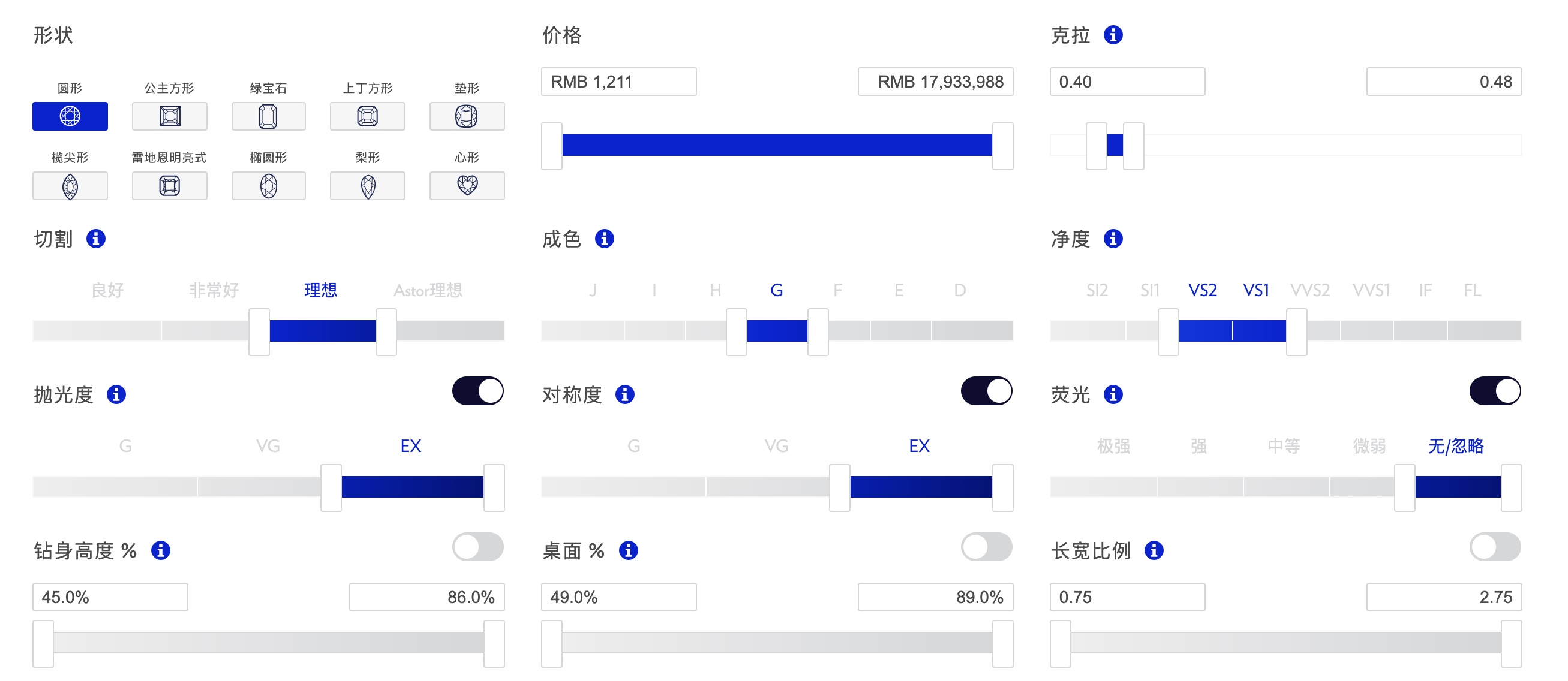 可以登陆 Blue Nile 的网站,手动调整一下参数,看下每项的解释实际感受一下: