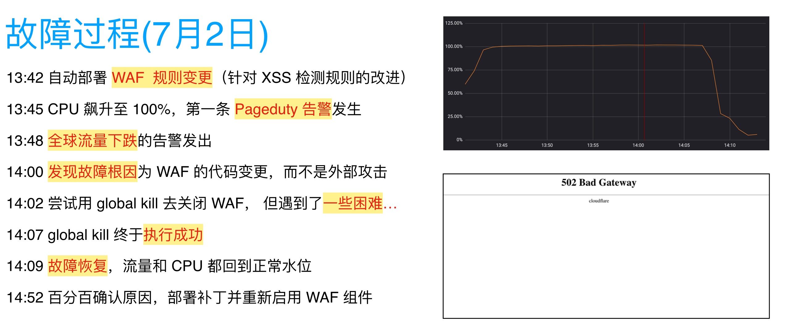 而作为一名 SRE,明白在故障的整个生命周期中,最关键的一环就是故障复盘(postmortem),以防止同样愚蠢的错误不再发生(通常大故障都是由很多小错误连锁造成的)。前天在千岛湖 outing 半夜四点睡不着的时候,起床偶遇这篇文章《Details of the Cloudflare outage on July 2, 2019》, 一口气读完了,写的很精彩(很会讲故事),当然总觉得还缺了什么。