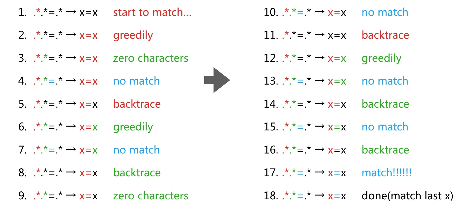 代码变更::更新 WAF 规则时,引入一个很容易回溯 (backtrace) 的正则表达式,尝试用画图去解释 backtrace 的原理(总步数与原文不一致,是因为我省略了一些步骤方便理解):