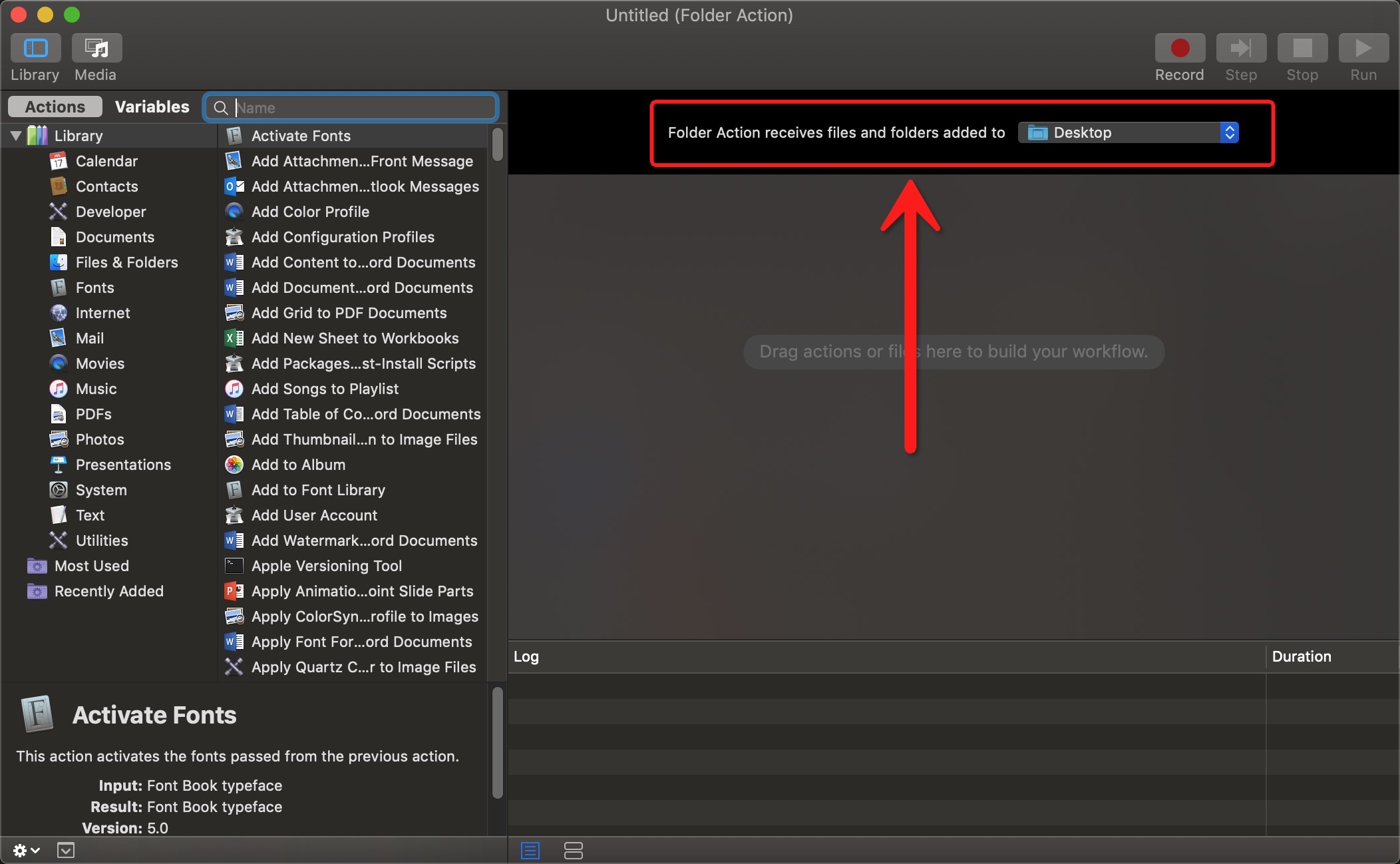 右上角的 “Folder Action receives files and folders added to”, 选择桌面: