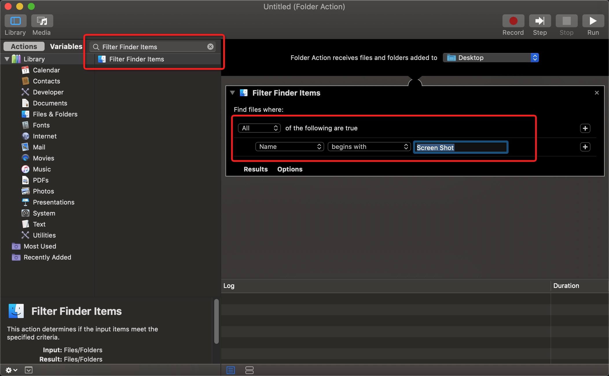 添加第一个 Action! 在左侧(Action Library) 选择 “Filter Finder Items” 并双击添加。然后编辑添加过滤 “Screen Shot” 开头的文件(如果是中文系统这里可能有点不同):