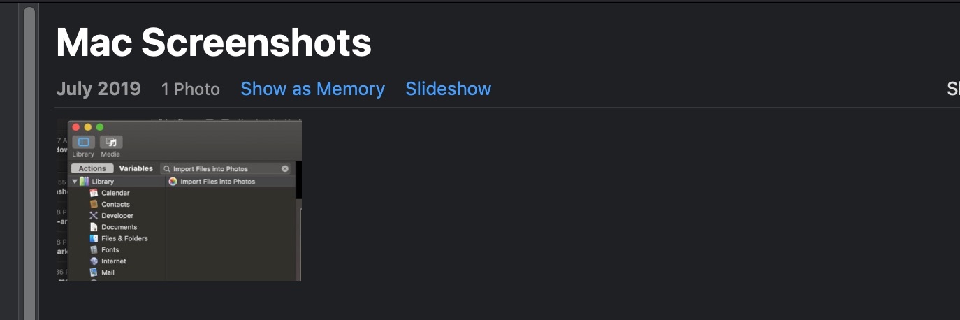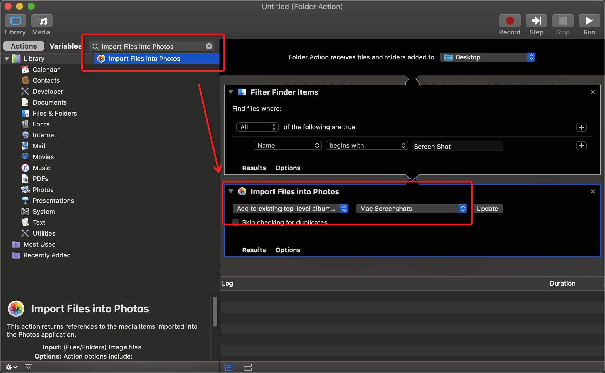 再新建一个 Action(Import Files into Photos),把截图导入至对应的相册: