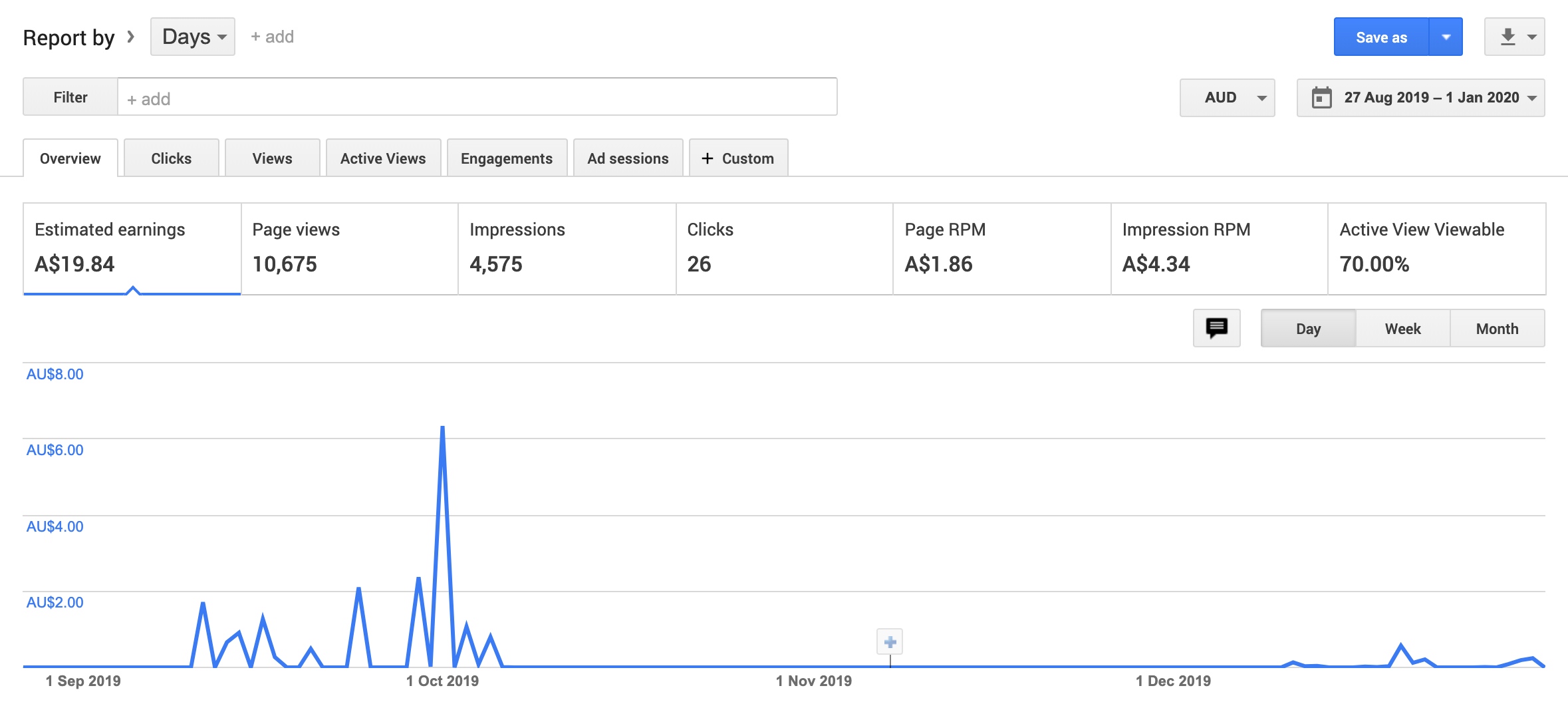 九月份开始在 adsense 上做了一些尝试,至少还是有一定收获的,但 11-12 月有一些空白是因为验证地址出了一些意外。。还是挺遗憾的。但不管怎么说,20澳元也是个不大不小的突破了,给自己点赞👍