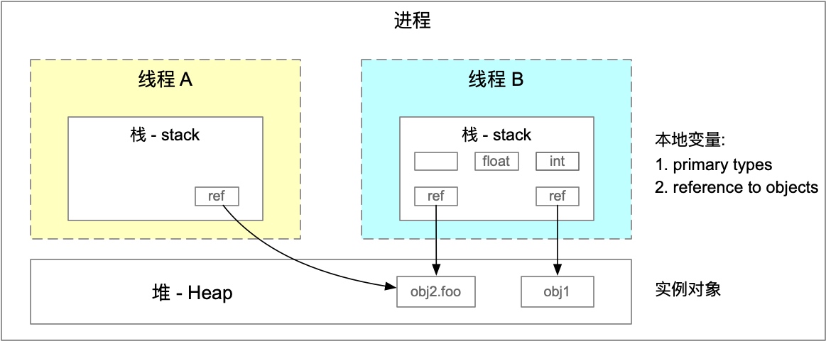 而每个栈帧(Stack Frame)中,本地变量(Local Variables)与 Heap 的关系如下: