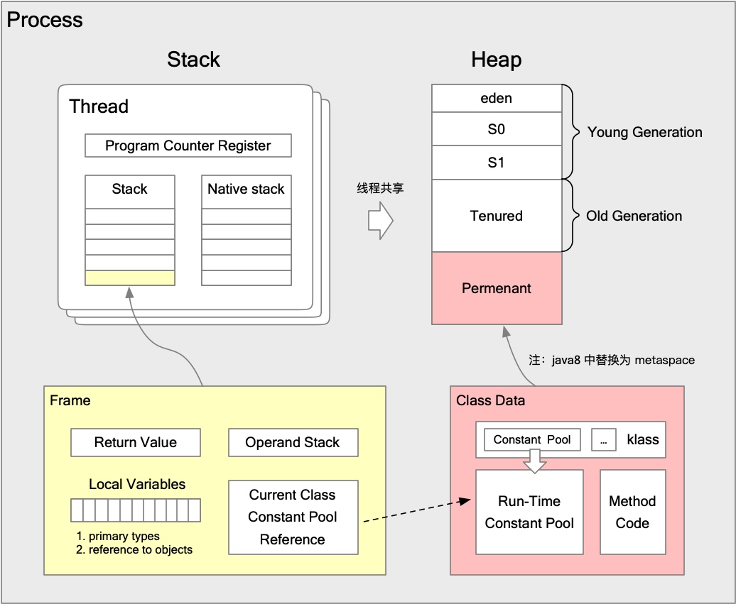 所以花了一点时间,尝试通过「栈」和「堆」两个视角,将 java8 的内存分布重新绘制一遍加深理解: