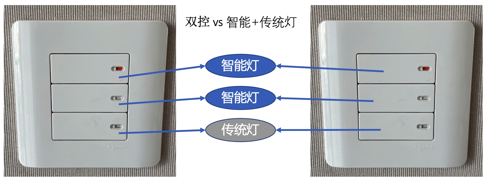 | 单控 vs 双控 | 双控指两个开关面板可以同步控制一个灯,即在开关A关闭灯1,然后在开关B打开灯1 |