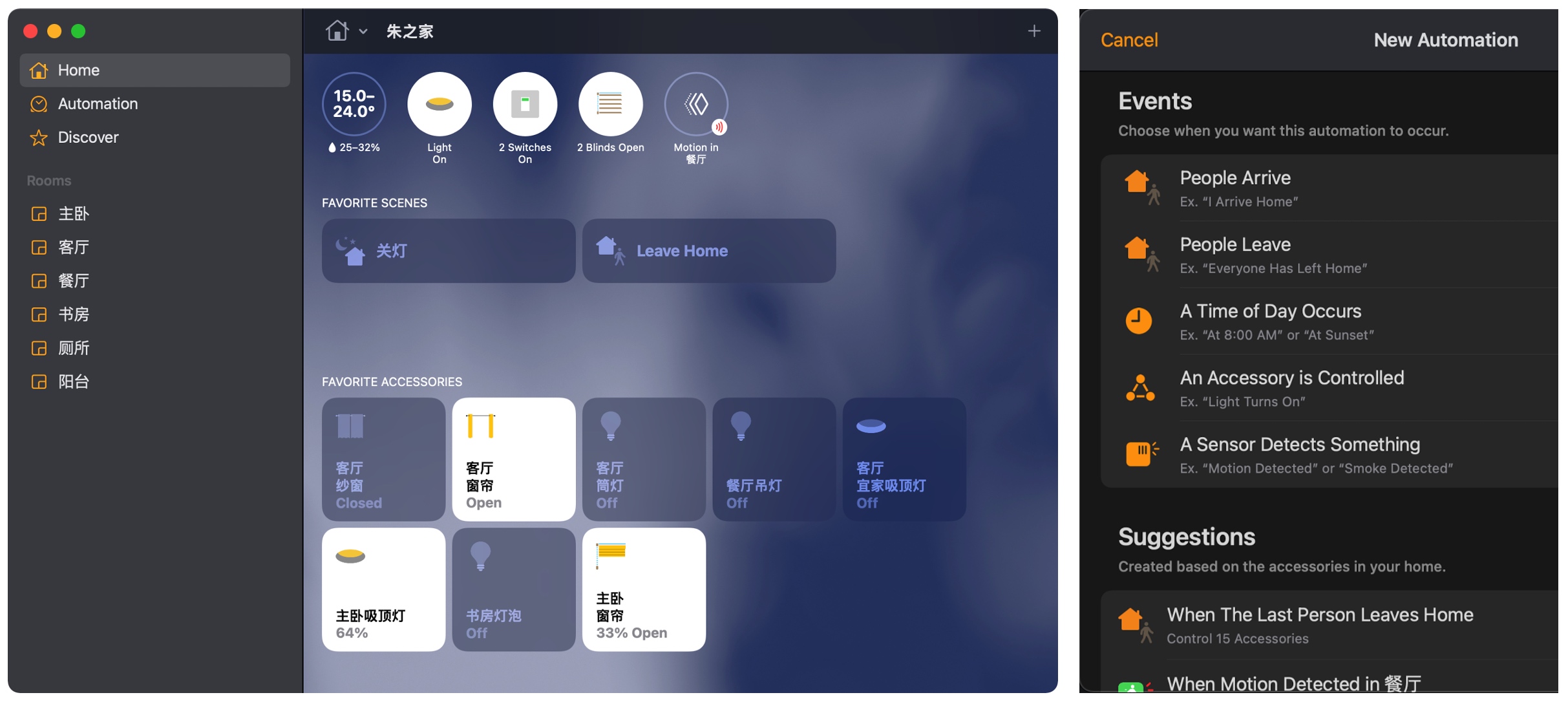 补充一下:为什么选择 HomeKit? 一方面当然是相信苹果封闭生态把控的良好体验;另一方面因为家人用的苹果手机,并且暂时没有更换智能锁的计划,所以只有 HomeKit 可以实现如下前置条件:当最后一个人离家的时候 -> 触发 xxx 自动化场景。