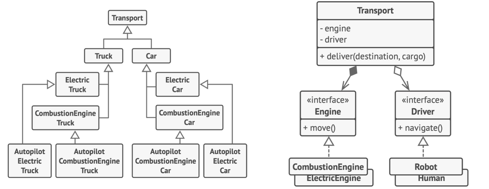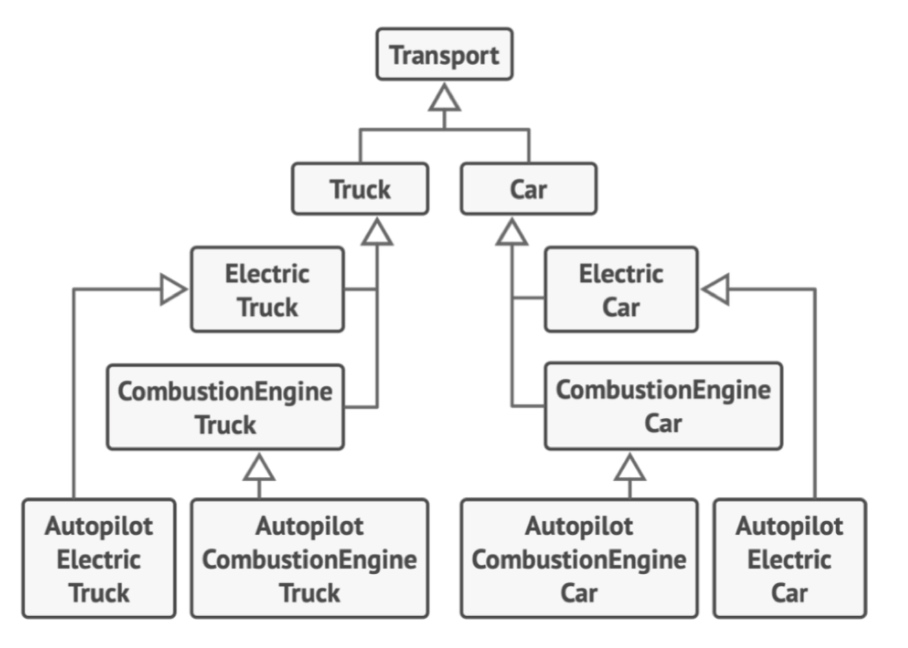 想象下面这个例子:公司同时生产汽车 Car 和卡车 Truck,车辆可能是电动车 Electric 或 汽油车 Combustion; 所有车型都配备了手动控制 Manual control 或 自动驾驶 Autopilot 功能: