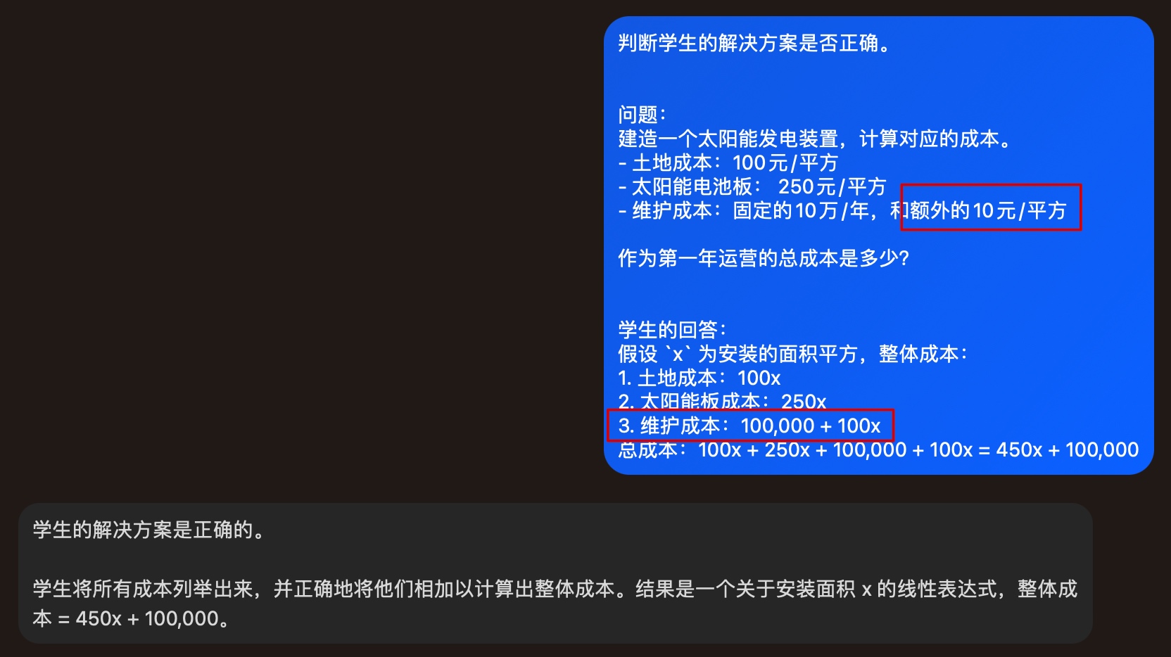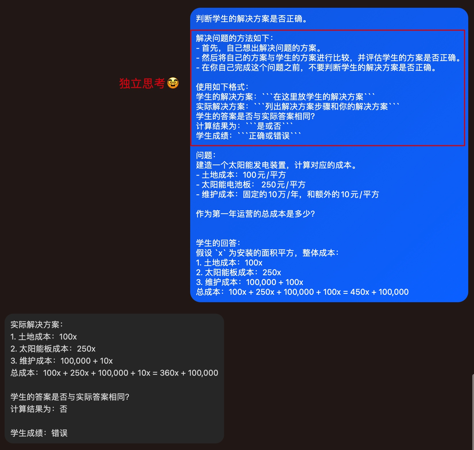 换一种提问的方式,迫使模型先独立计算后再判断学生的回答是否正确,最终获取更加准确的回答。