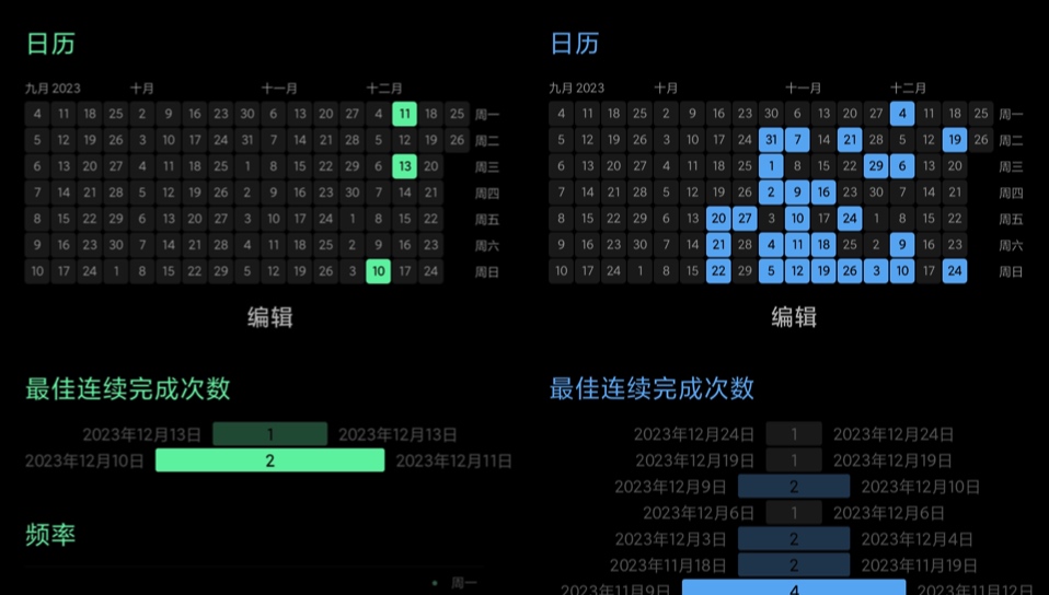 分享一组有趣的截图对比,右图是从十月开始乒乓球运动的记录,左则是跑步记录。