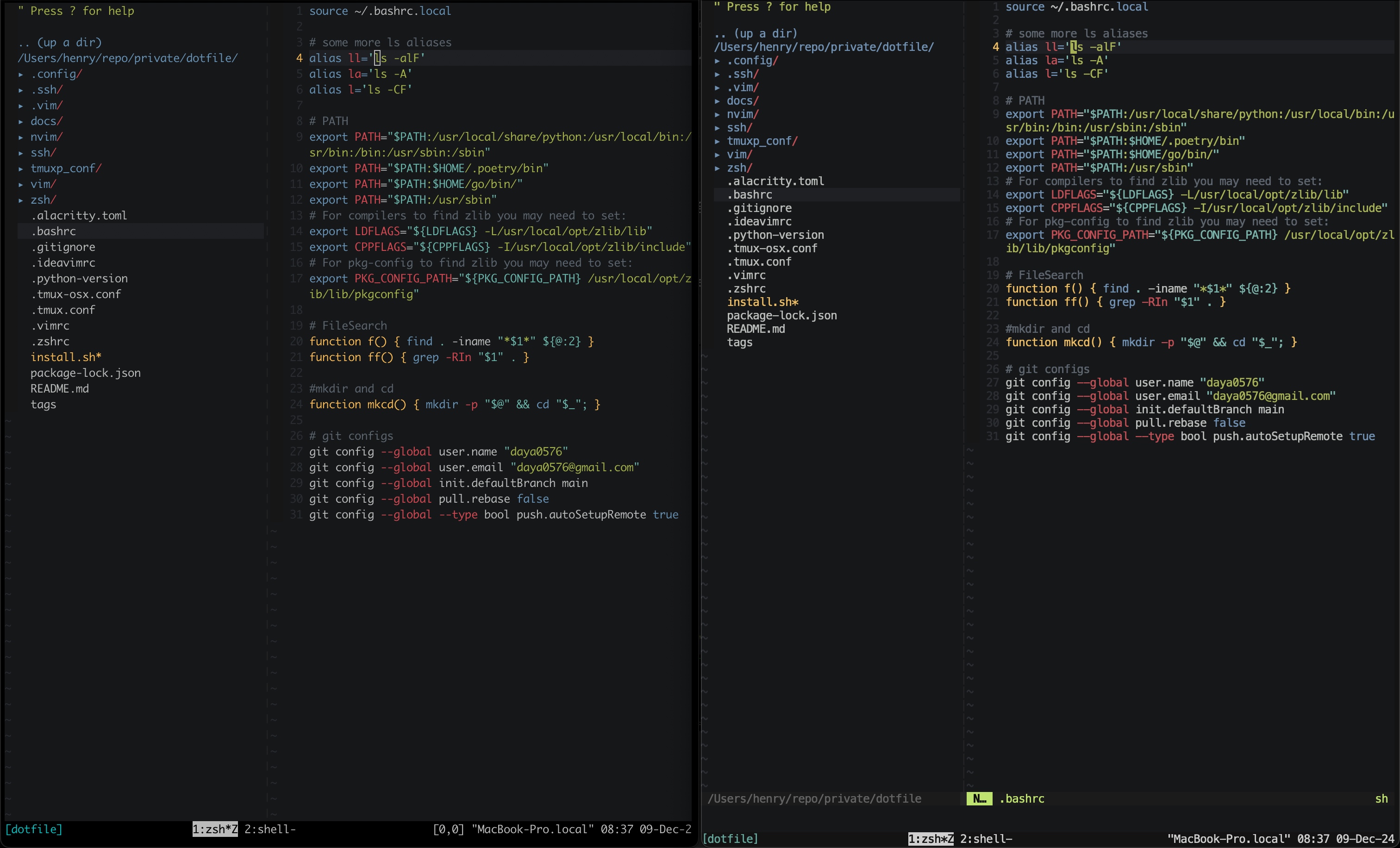 上手的过程并非一帆风顺,可以看到初次开启后,右边的 Alacritty 在配色和字体渲染方面明显劣于左边的 iTerm(或许是因为习惯):