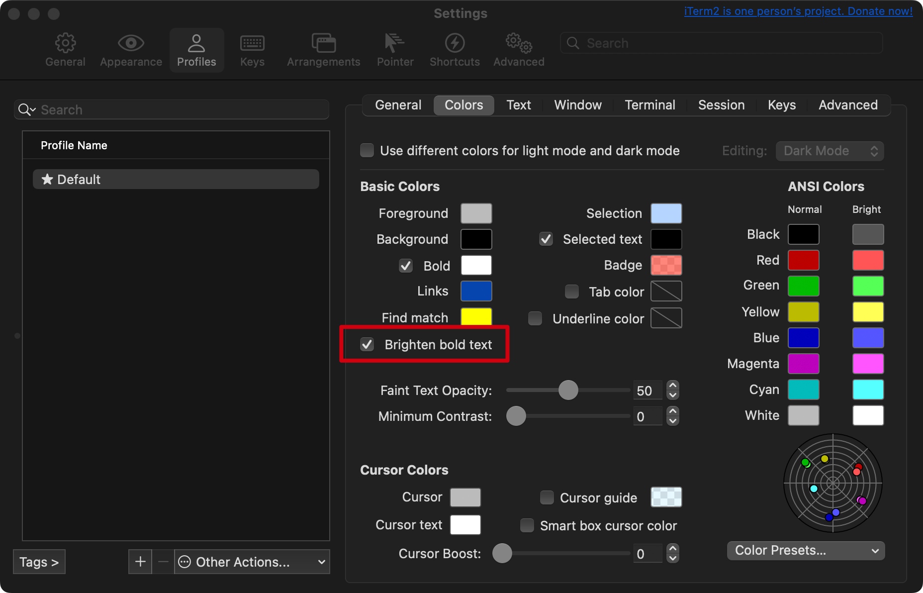 在 iTerm 中,颜色明显更“亮”一些,排查后是由于 “Brighten bold text” 导致: