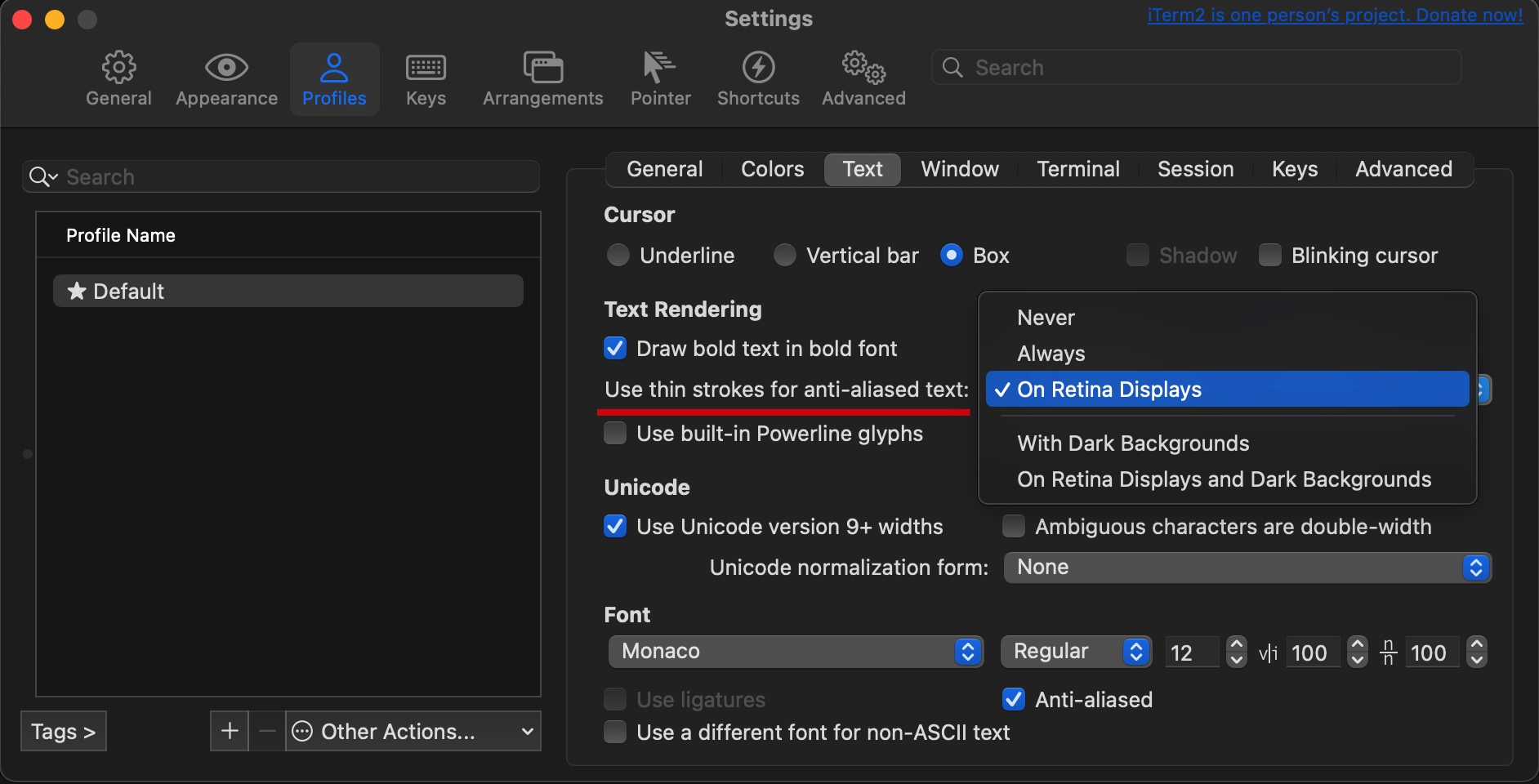 即使已设置相同字体,iTerm 中的字符却看上去明显更“细”一些。