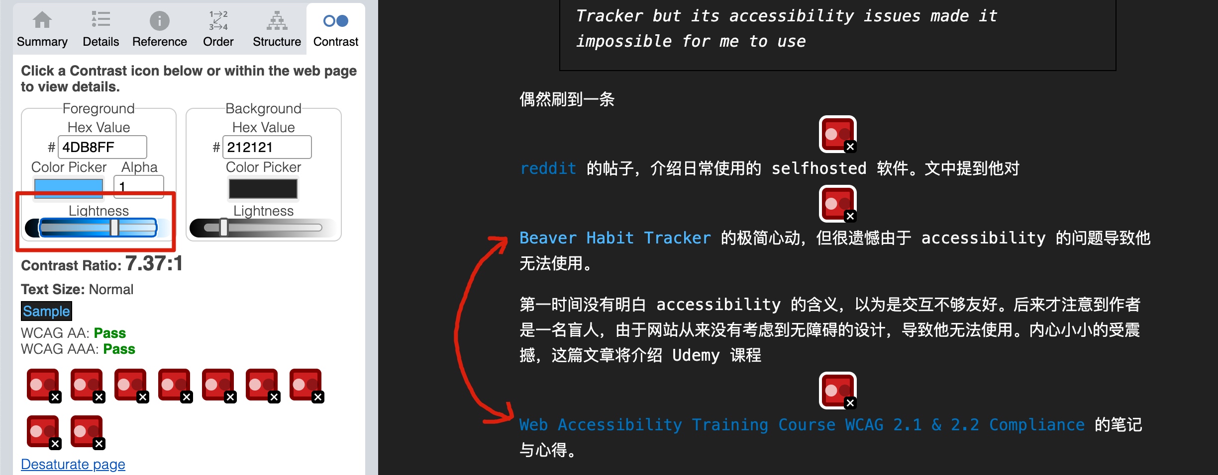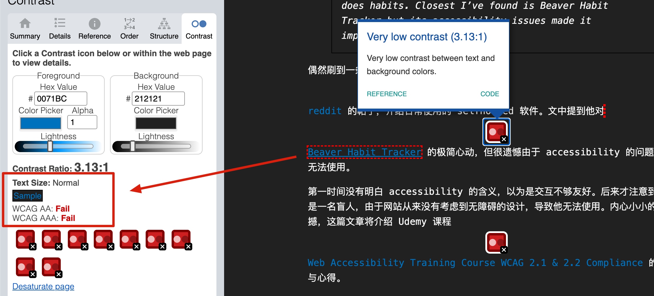 以个人博客为例,可以使用 WAVE 软件来改善网页的对比度(对比度的范围:1 - 21)。可以看到正文的对比度符合要求,但链接的对比度有待提升(注意不同字体大小的对比度要求不同):