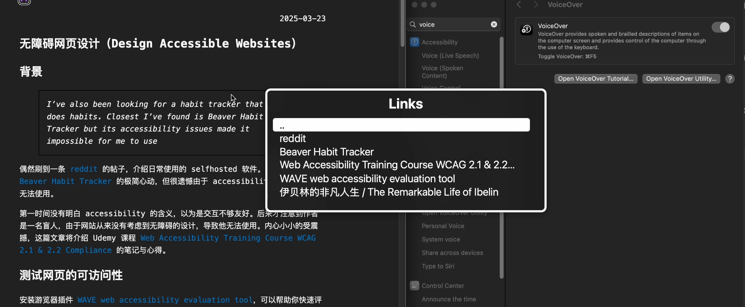 当盲人使用 screen reader 游览网页时,常常会一次性获取所有的链接方便进一步阅读自己感兴趣的信息。下图为在 macOS 中使用 VoiceOver 时,ctrl+option+u 获取链接菜单: