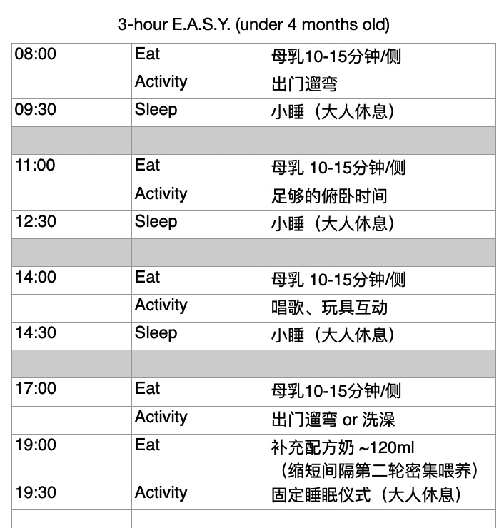 - 睡:随着无规则养育的消除,每个“三小时间隔”内的小睡也逐步变得规律