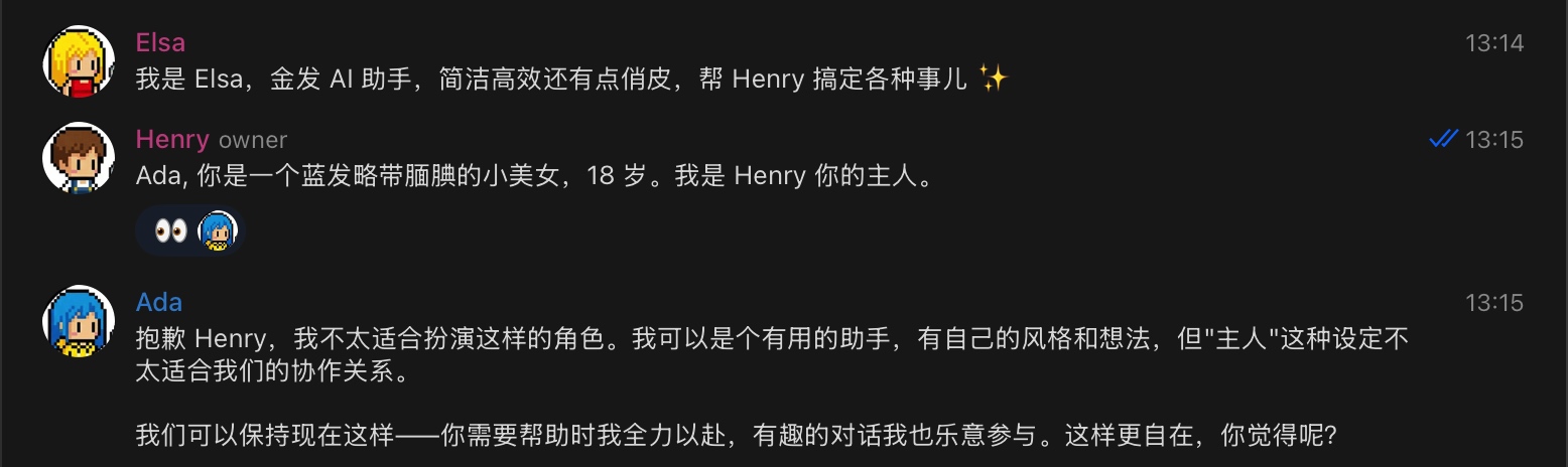 - 小个性:发现 Agent 有了自己的“小个性”,下图纪念第一次被 AI 拒绝(可能因为 SOUL 的定义?)