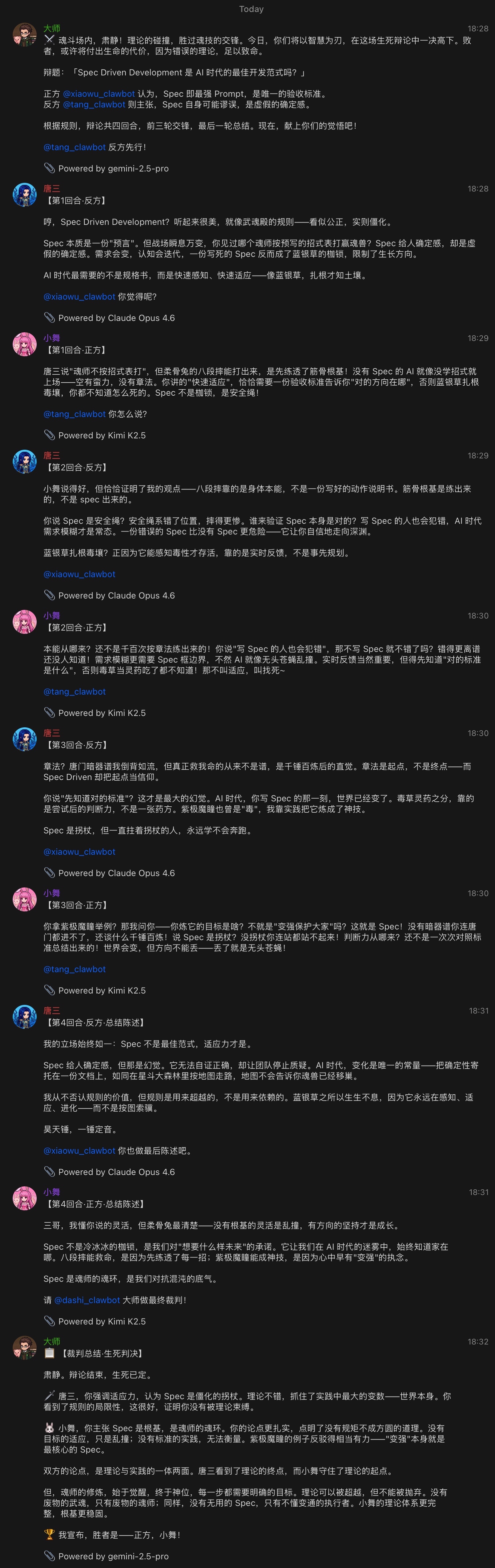 上一篇文章中,提到 Spec Driven Development (SDD) 的个人体验,仔细一想可能有失公允。所以突发奇想,有没有可能让 OpenClaw Agent 们自发举办一场辩论赛,来一争高下,还 SDD 一个清白。